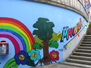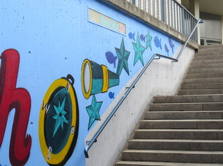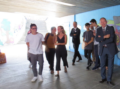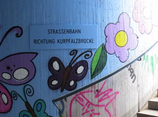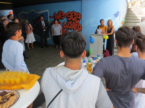 Zentrales Thema war dabei auch der „Angstraum“ der Unterführung zwischen Keplerschulen und MVV als einzigem Zugang zu den Haltestellen. Nun konnten die beiden mit ihren Mitschüler*innen selbst Hand anlegen. Gemeinsam mit street-art („Straßenkunst“, gemeint ist damit die künstlerische Gestaltung des öffentlichen Raums) Künstlerin Steffi Paichal und Schulsozialarbeiterin Susanna Wolff erarbeiteten sie ein Konzept, um nicht nur doe Unterführung sondern auch die Zugänge zu Geh- und Bahnsteigen der Unterführung farbenfroh und fröhlich zu gestalten. Musiknoten, Fische und Vögel zieren nun die Zu- und Abgänge zur Unterführung und verbinden den Hafen mit den Quadraten. Der beim Kindergipfel vorgeschlagene Regenbogen zur Verschönerung von Unterführungen darf natürlich nicht fehlen und heißt die Schüler*innen gleichsam willkommen. Organisatorisch unterstützt wurde das Projekt auch in diesem Jahr wieder vom Quartiermanagement Unterstadt. Verschiedene Fachbereiche der Stadt Mannheim standen mit Rat und Tat zur Seite. Mitarbeiter*innen der Abfallwirtschaft und Teilnehmer*innen des BIWAQ-Projekts ZUWAMA der Biotopia stellten sicher, dass die Schüler*innen zu Beginn der Arbeiten eine saubere Arbeitsatmosphäre vorfinden konnten. Ohne Moos nix los: SiMa (Sicherheit in Mannheim) e. V, die Badische Beamtenbank/der Gewinnsparverein Südwest, der Bezirksbeirat Innenstadt/Jungbusch, die Spardabank, die VR Bank, Pro Bono für Kunst und Kind, die Firma Silbernagel und Bauhaus Waldhof haben den Schüler*innen bei der Umsetzung des Projekts mit Geldspenden und Sachmitteln geholfen, damit die Unterführung